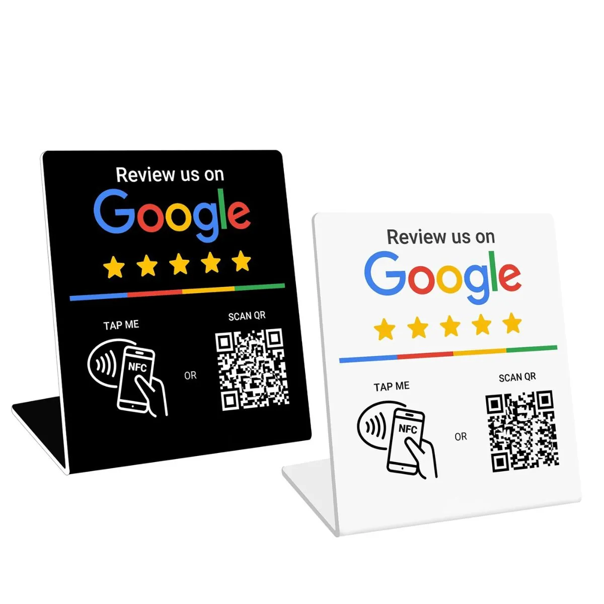 Our modern acrylic Google review stand combines NFC tap technology with a dynamic QR code so your customers can open your Google review page instantly.