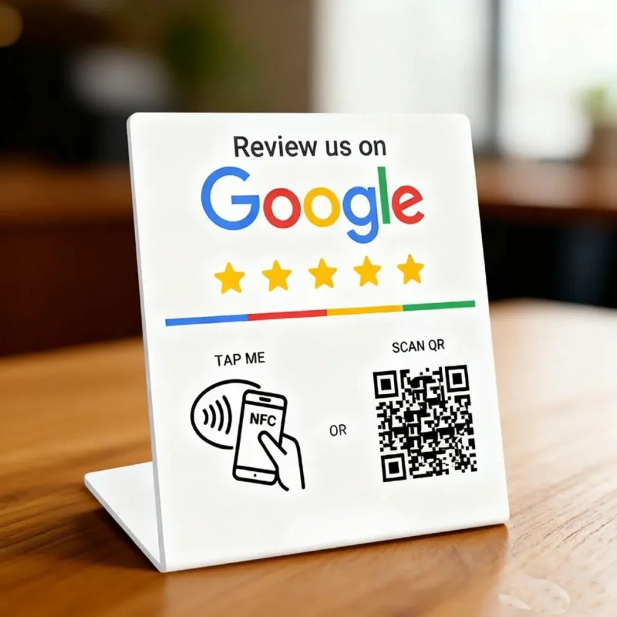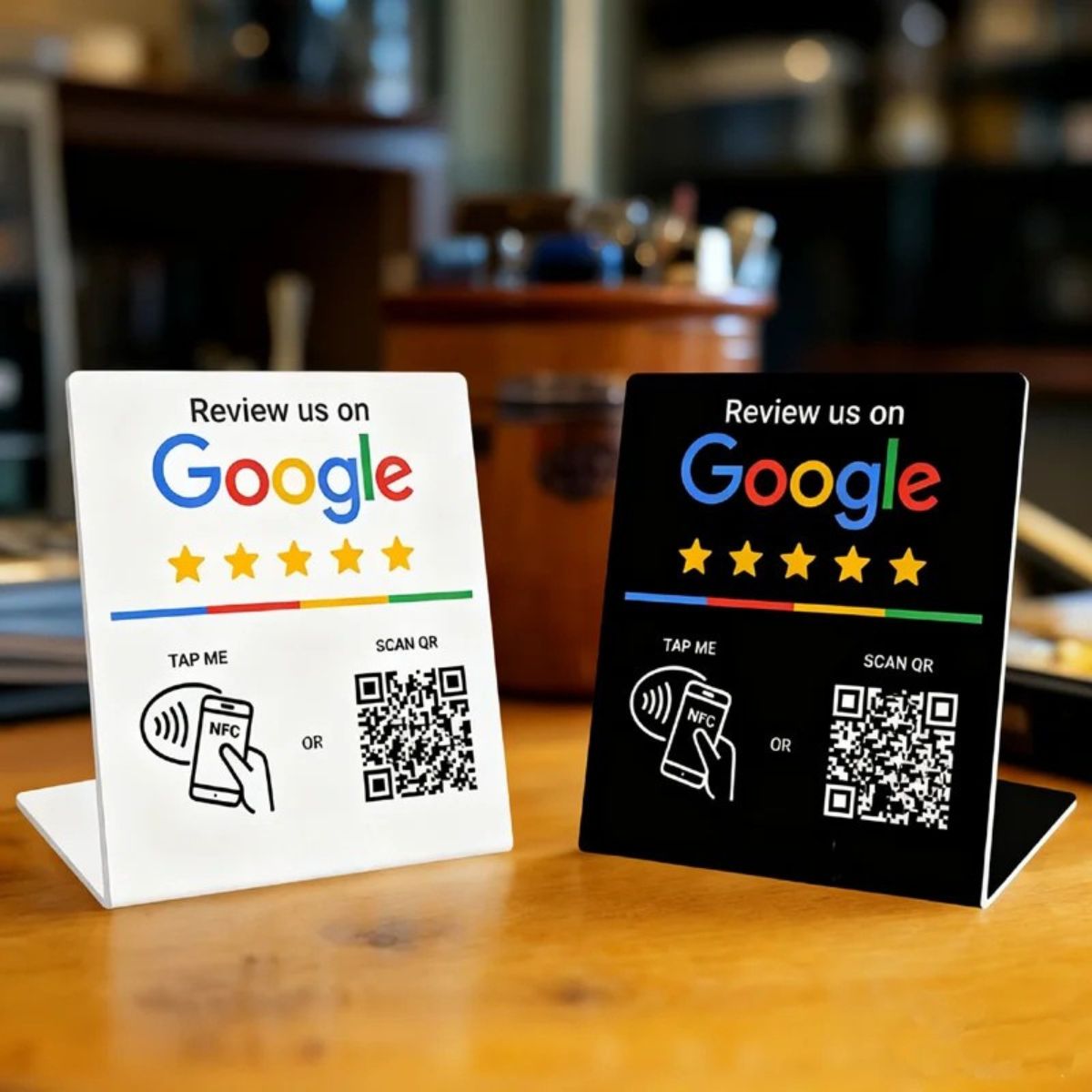 They’re NFC and QR code enabled cards, plates, and stands that let customers tap or scan to open your Google Review link instantly.